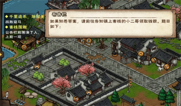 烟雨江湖客栈围趣是近期游戏中上线的全新算数解题任务,游戏中玩家需要将正确解谜出来的答案告知NPC才可以通关,在客栈围趣有2个问题,下面就由小编带来客栈围趣答案解析,有需要的小伙伴一起了解一下。